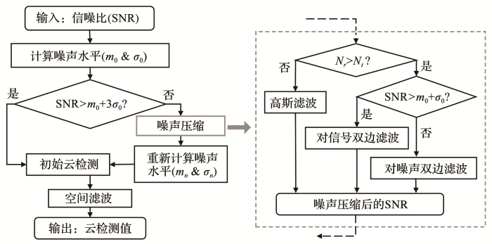 ... 我们先以兰州大学半干旱气候与环境观测站(Semi-Arid Climate and Environment Observatory of Lanzhou University,SACOL)Ka波段云雷达(Ka-band Zenith Radar,KAZR)为例[39,44,45],说明双边滤波噪声压缩方法在地基雷达云检测中的应用.在传统的地基雷达云检测算法中引入双边滤波噪声压缩方法,如图3灰色框所示,注意输入数据为雷达信噪比(Signal-Noise Ratio,SNR)而不是回波强度,这是因为KAZR的SNR更符合高斯分布,适用于噪声压缩[39].与2.1节所述简单二值云检测产品不同,这里给出了每个雷达距离库的云检测值(cloud mask value),越大的值表示该点有云的可信度越高,并考虑不同云检测值可信度的不同,在空间滤波处理中引入中心权重方案. ...