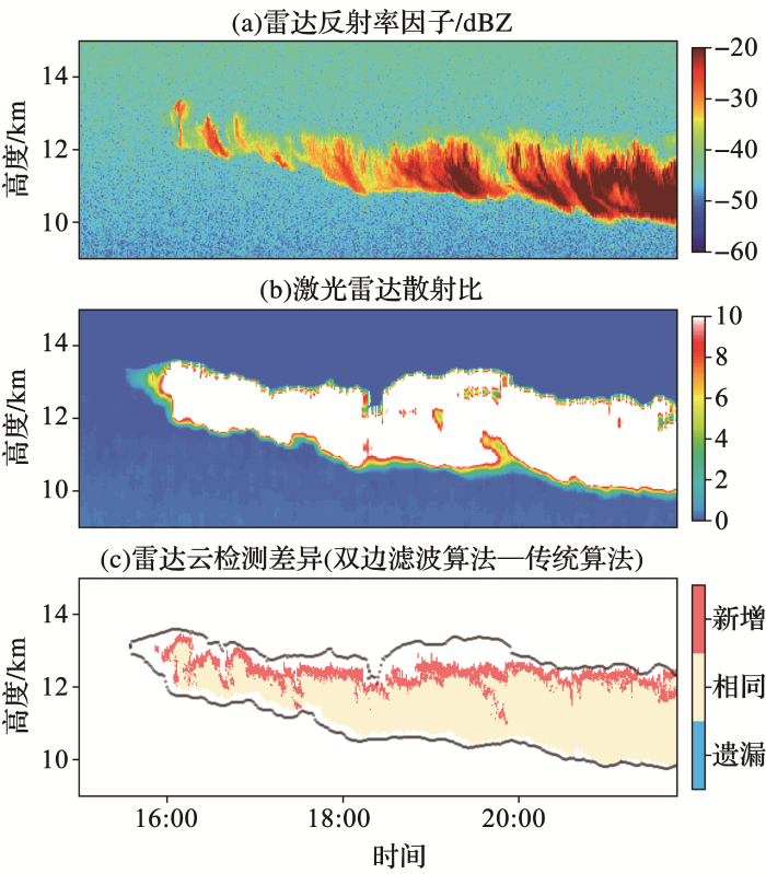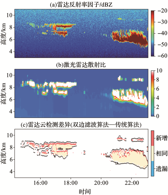 ... 图4以SACOL站2014年11月13日14:00-23:00(世界时)观测为例,验证双边滤波对地基雷达云检测算法的改进.考虑微脉冲激光雷达(Micro-Pulse Lidar,MPL)对小云滴粒子敏感性更好,进而以MPL同步观测[46]作为参考对比KAZR结果.由图4a可以看出,15:00-18:00,7 km和8 km左右的高空存在2层薄卷云,厚度约为500 m.8 km左右处的薄卷云的边缘雷达反射率因子较小,说明边缘处冰晶粒径较小或数浓度较低.而7 km左右处薄卷云的边缘更为清晰,与噪声有较为明显的分界,与云内其他区域反射率数值接近,说明云内冰晶粒子性质较为均一.这2层薄卷云虽然高度和厚度差异不大,却可能处于云生消过程的不同阶段,因此造成了云边缘的不同形态.20:00-23:00也存在2层云,9 km左右的薄卷云厚度甚至不到100 m,其雷达反射率因子略高于背景噪声值,难以判别与噪声的边界,4~8 km处的云反射率因子较大.图4b给出了激光雷达的观测结果,分布与云雷达观测较为一致,证实了这4个区域存在冰云.为了清晰比较双边滤波算法的改进,我们用传统和双边滤波2种方法分别进行云检测,结果如图4c所示,激光雷达探测到的冰云厚度(图4c中黑点)普遍高于毫米波云雷达(图4c中红色和黄色区域),这是因为MPL比KAZR波长更短,对小粒子具有更高的敏感性[47~49],双边滤波改进算法多检测出的信号多位于云顶,如16:00-18:00的2层薄卷云较为平整的云顶和20:00-23:00 8 km处较为波动的云顶,这是因为冰云云顶附近的冰晶粒子更小[50],散射回波较弱,难以被传统云检测算法准确识别.云底处的云滴粒径更大,能够被传统算法识别,所以无明显改进.值得注意的是,对于特别薄的卷云(16:00之前8 km左右处和21:00-23:00 9 km左右处的卷云),其冰晶粒子和数浓度都很小,反射率因子只略微高于噪声水平,传统算法几乎没有检测到信号,但引入双边滤波后,有效识别出之前漏检的薄云信号,说明了该算法对弱回波信号的识别能力. ...