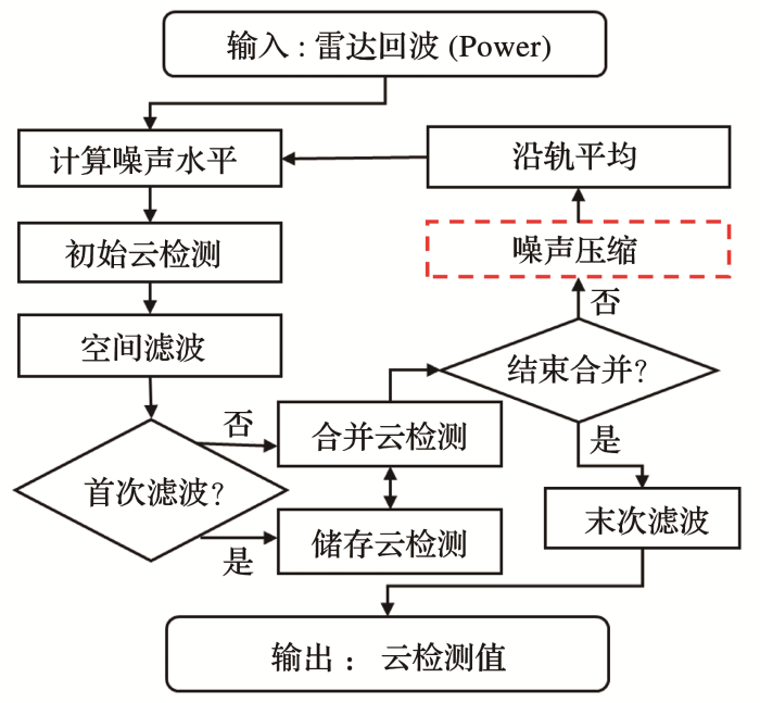 ... 如前所述,双边滤波噪声压缩方法是对噪声和信号分别处理的思路,并无其他假设或限制,有很好的适用性和可移植性(如图3右侧红框所示),可以根据不同仪器性质及算法方案进行调整适应.我们进一步将双边滤波噪声压缩方法应用在CloudSat星载云雷达云检测中,星载云雷达受限于自重和采样间隔,难以拥有和地基云雷达相似的高发射功率或大直径天线,所以仪器本身对冰云敏感性较低.为此,其产品开发团队引入沿轨道平均方案,即对原始回波进行多次沿轨道方向的平均,提高信噪比,以捕捉不同水平尺度的冰云,尽管该方法提高了对冰云的敏感性,然而噪声和信号的混合平均,使得弱信号误检率达35%~65%[42],在实际中无法正常使用[51,52].CloudSat团队为了解决该问题,提高了滤波阈值,并于2017年4月公布了R05新版数据,我们以CALIPSO激光雷达为参考,发现R05版本的弱回波信号误检率相比R04确实有下降,但却以损失大量真实弱云信号为代价.对此,我们引入双边滤波的云检测思路,并根据其自身的沿轨道平均方案进行调整,在沿轨平均之前进行噪声压缩,算法流程如图6所示,同时使原本沿轨道平均方案中多次云检测值的叠加可以不受新增云检测值位置的限制[53],从而保留了更多云边界信号. ...