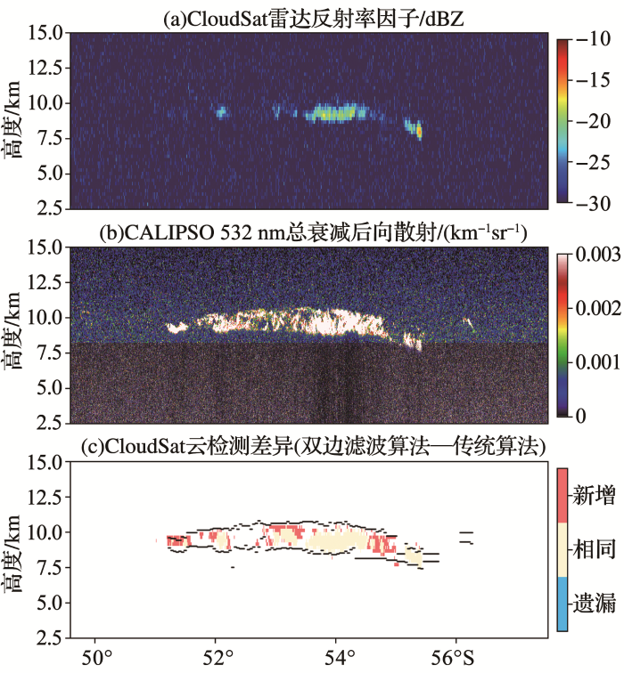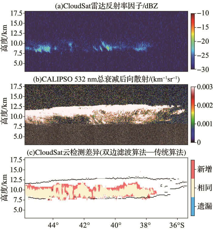 ... 云雷达通过天线集中向某一个方向发射能量,并接受该方向有效照射体积内目标物的后向散射回波,其信号强弱取决于单位体积内目标物的雷达后向散射截面大小以及距离雷达的远近.实际观测中,雷达除了接收来自目标物的后向散射信号外,还受到包括由接收机、线路电阻器件、放大器和混频器等内部噪声,以及天线接收的地表或大气中其他物质发射微波辐射造成的外部噪声.因此,利用雷达观测反演云宏微观物理特征前,首先需要将原始数据中的噪声和云回波信号进行区分(即云检测识别).云检测中对于显著高于噪声水平的强回波信号,可以通过阈值设置较易识别,但当云回波信号较弱与噪声水平接近时,则大幅增加了准确判识的难度,一直是微波雷达目标物识别中存在的难点问题,而这些弱回波信号一般来自小粒径或稀薄的冰云粒子,常出现在云层顶部边界或高海拔地区,这些位置的云都具有较强的温室效应,会显著影响辐射收支也常与云的形成或消亡有关[37,38],准确识别这些云滴粒子对于理解云生消过程及其对气候能量平衡的作用有重要意义.本文将计算机图像处理中的双边滤波思想引入到地基—空基云雷达云检测算法中[39],有效提升了雷达对弱回波信号的识别能力,并显著降低了识别的漏检率.全文首先介绍了双边滤波噪声压缩方法(简称双边滤波方法);进而给出了该方法在地基和星载微波云雷达对弱云信号检测识别能力的具体提高改进;最后以航空飞行器航迹检测为例,给出了该方法在其他雷达探测领域对弱回波信号识别的潜在价值,对该方法的推广应用做出了展望. ...