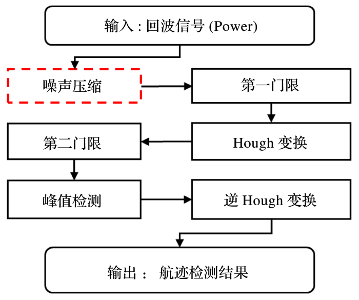 ... 飞行器的回波在雷达图像中常表现为一条直线,这时的目标检测问题就转化雷达图像中的直线检测问题,而其中最典型的方法之一就是Hough变换[56,57].Hough变换的基本原理在于利用图像空间与参数空间之间的点线对偶性[58].对于航迹检测来说,可以首先选取一定阈值(即第一门限)筛选雷达回波信号,对大于阈值的信号,将其转换为参数空间中的直线.经过参数空间中某一点的直线越多,表示该点所对应的图像空间中的直线信号越强.然后选取第二门限,筛选出参数空间中大于第二门限的格点,即检测点,寻找其中积累能量最大的点,即峰值点.最后通过逆Hough变换,将参数空间的峰值点映射回图像空间,即可得到检测的航迹.由以上航迹检测的步骤可以看出,阈值的选择对于航迹检测的结果至关重要.阈值太低会出现大量虚假航迹,即高虚警率,影响实际决策;阈值过高,又会遗漏较弱的航迹信号,即高漏警率,从而影响及时部署.如前所述,双边滤波的噪声压缩方法,能在压缩噪声的同时保持信号边界,从而可以选择更低的第一门限,使得更多弱航迹信号在参数空间中积累而尽可能少的受噪声影响,使得虚警率和漏警率都在较低水平.我们在Hough变换的航迹检测方法中引入了双边滤波噪声压缩方法,流程如图9所示. ...