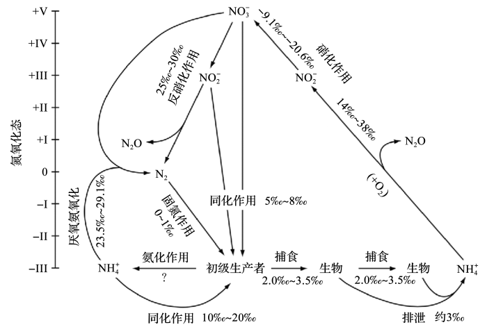 3 )以及有机氮(Organic Nitrogen,ON)等形式,各种形态的氮化合物化学价态变化较大(-3价~+5价),不同价态间的相互转变会产生显著的同位素分馏(-10‰~30‰)(