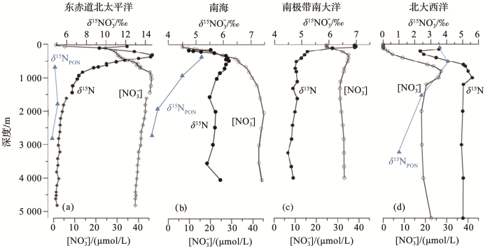 图2 不同海域垂向硝酸盐含量(空心圆圈)、硝酸盐(实心圆圈)及颗粒物(蓝色实心三角)稳定氮同位素变化模式(据参考文献[15 ,16 ,17 ,18 ]修改) Vertical variability of nitrate content (hollow circle) and stable nitrogen isotope of nitrate (solid circle) and sinking particles (blue solid triangle) in different sea areas (modified after references [15~18]) Fig. 2 ![]()