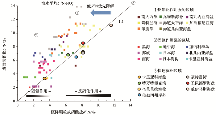 图3 全球不同大洋沉降颗粒(矩形)或硝酸盐(圆形)与表层沉积物的稳定氮同位素对比(据参考文献[49 ]修改) Stable nitrogen isotope comparison of sinking particles (rectangular) or nitrate (circular) with surface sediments from global oceans in different sites (modified after reference [49 ]) Fig. 3 ![]()