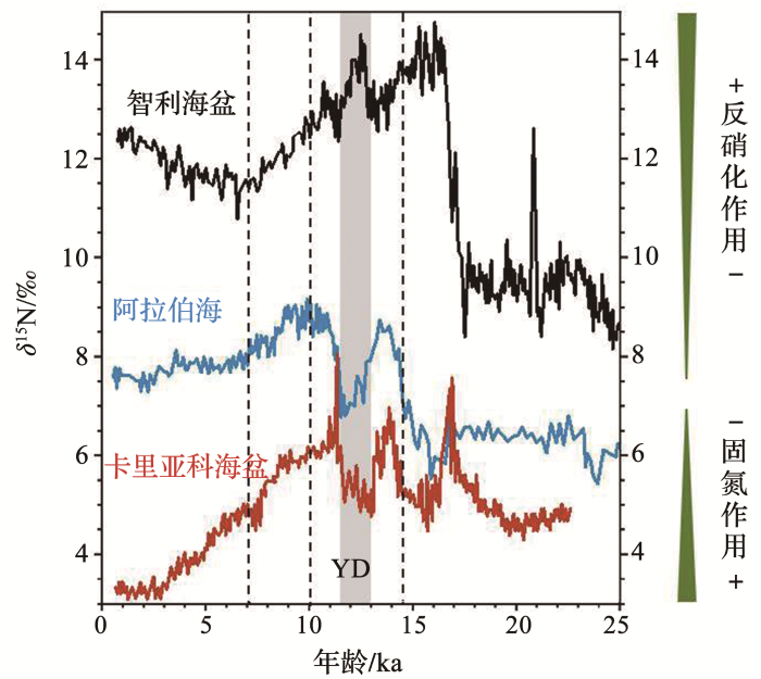 δ 15 N低于冰期的记录,可能是因为固氮作用引起的氮同位素分馏程度小,被反硝化作用的巨大分馏信号压制,导致沉积物缺乏明显的固氮信号.Kienast