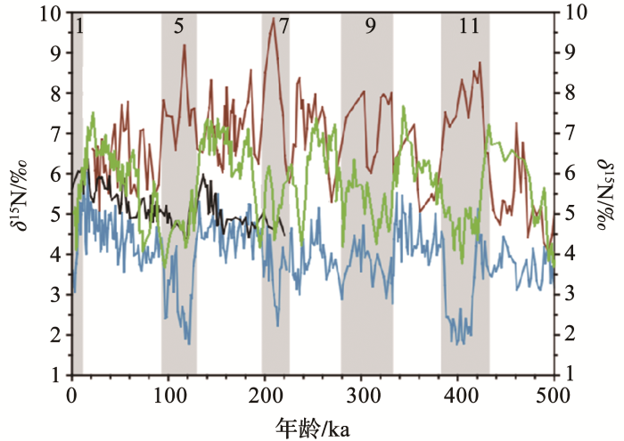 图5 不同类型海域50 ka 沉积物稳定氮同位素记录对比(据参考文献[69 ,88 ]修改) 卡里亚科海盆(蓝色)沉积物δ 15 Nbulk [79 ] ;阿拉伯海(棕红)沉积物δ 15 Nbulk [19 ] ;南海沉积物δ 15 Nbulk (黑色)[86 ] 和FB-δ 15 N(绿色)[89 ] ;阴影部分为间冰期,数字为海洋同位素阶段 ...