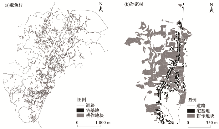研究数据主要包括高分辨率无人机影像解译的空间数据和对2个典型村进行的入户调查数据两部分。研究过程分为2个调查阶段。第一阶段为空间数据的采集,采集时间为2018年6~8月,使用无人机获取2个典型村空间分辨率为0.1 m的遥感影像,对影像进行预处理后,解译提取亚鱼村和孙家村的宅基地、耕地、道路(通村路、机耕路、田埂)等空间信息,2个村庄共计获取1 287户宅基地、10 489块耕地地块、30 260条道路。为验证提取结果的精度,通过Google Earth获取的影像和实地考察2种方式,对解译结果进行验证,结果表明影像解译精度分别达到96.59%和94.36%,解译结果可信。最后运用ArcGIS空间分析工具(Spatial Analyst Tool)和网络分析工具(Network Analysis Tool)分别搭建2个村的道路路网,并进行拓扑检查与拓扑错误处理,实现宅基地到耕作地块的空间连接,初步构建了2个村庄的地表空间信息库。