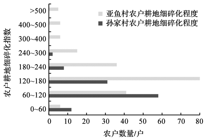根据公式(1)计算得出亚鱼村(195户)和孙家村(111户)样本农户的耕地细碎化指数(图2)。亚鱼村耕地细碎化指数多集中在120~180,共80户,耕地细碎化指数的最大值为1 643.230,平均值为187.980;孙家村耕地细碎化指数多集中在60~120,共58户,占全部农户数量的52.252%,耕地细碎化指数的最大值为264.784,平均值为111.931。总体来看,亚鱼村耕地的细碎化程度高于孙家村。