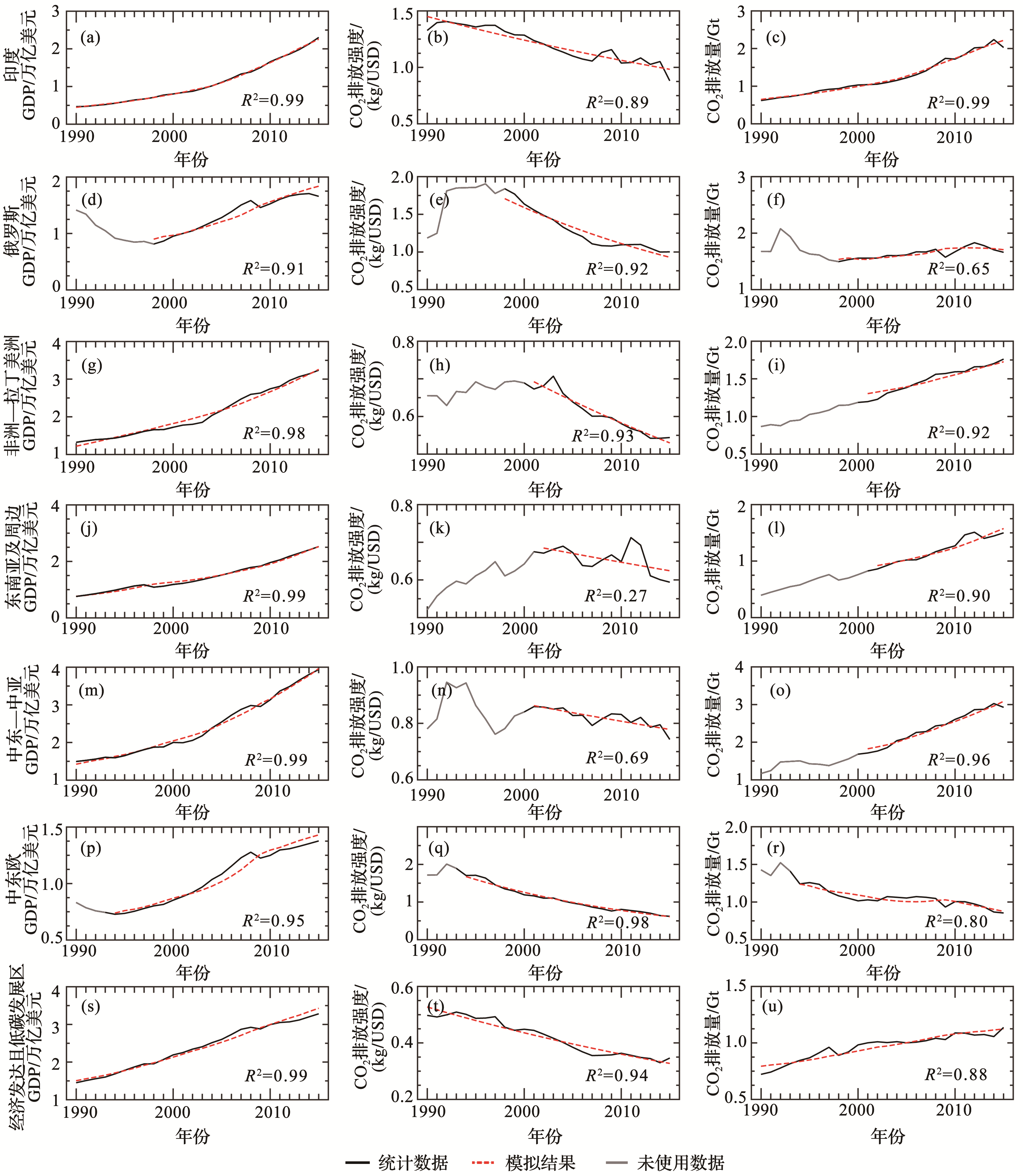 | Fig.2 Simulation and statistical data of GDP, CO2 intensity and CO2 emissions during 1990-2015 in each subregion (a)~(c) India;(d)~(f) Russia; (g)~(i)Africa and Latin America;(j)~(l)Southeast Asia and its sourrounding;(m)~(o) Middle East and Central Asia;(p)~(i) Central and Eastern Euorpe;(s)~(u) Economically developed and low-carbon region |