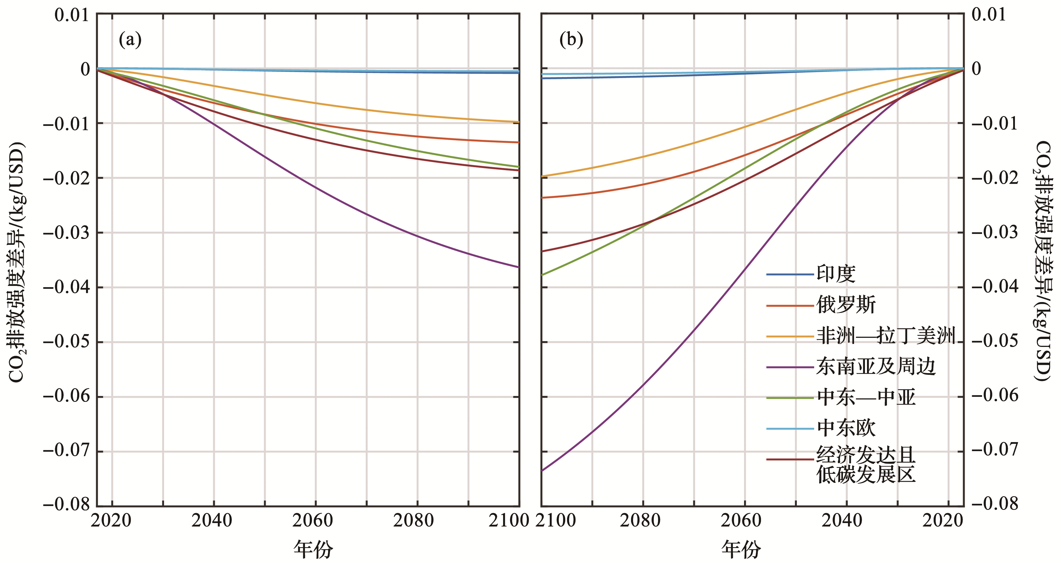 | Fig.4 The differences in CO2 intensity between business-as-usual (strengthening) investment scenario and no-investment scenario in each subregion from 2017 to 2100 (a) Business-as-usual investment scenario minus no investment scenario; (b) Strengthening investment scenario minus no-investment scenario |