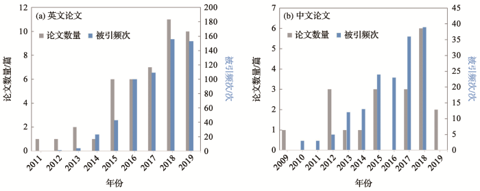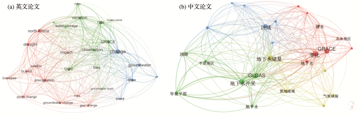 基于英文文献题目、摘要和关键词构建主题脉络图显示(图3),词频排列前五位的分别是GRACE、change、rate、variation和area.中文文献中,词频排列前五位的分别是变化、GRACE、地下水开采、全球陆面数据同化系统(Global Land Data Assimilation System,GLDAS)和地下水储量.为了进一步分析基于GRACE卫星监测中国地下水储量变化的中英文论文研究内容变化,依据发文量,将相关论文按照发表年份分为2009—2014年和2015—2019年2个阶段分析其主题词频.2009—2014年,英文论文词频排列前三位的分别是GRACE、north China plain和groundwater depletion;中文论文词频排列前三位的分别为GRACE、流域和变化.2015—2019年,英文论文词频排列前三位变为GRACE、change和rate;中文论文词频排列前三位的分别是变化、地下水开采和华北平原.词频分析表明,相关研究以量化地下水储量的动态变化过程为主,研究区主要集中于华北平原. ...