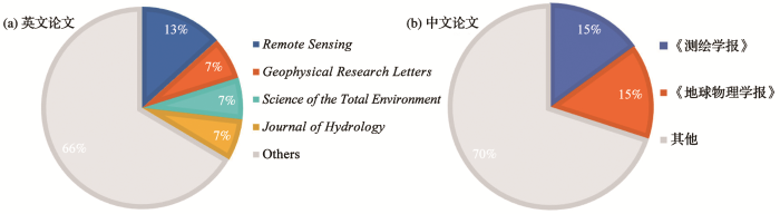 相关英文论文主要发表在Remote sensing, Geophysical Research Letters, Science of the total environmental和Journal of Hydrology上(图2)。其中,被引频次前五的英文论文合计被引355次,约占总被引频次的60.3%(表1)。中文论文主要发表在《测绘学报》和《地球物理学报》,被引频次前五位的中文论文合计被引118次,占论文总被引频次的74.7%(表2)。