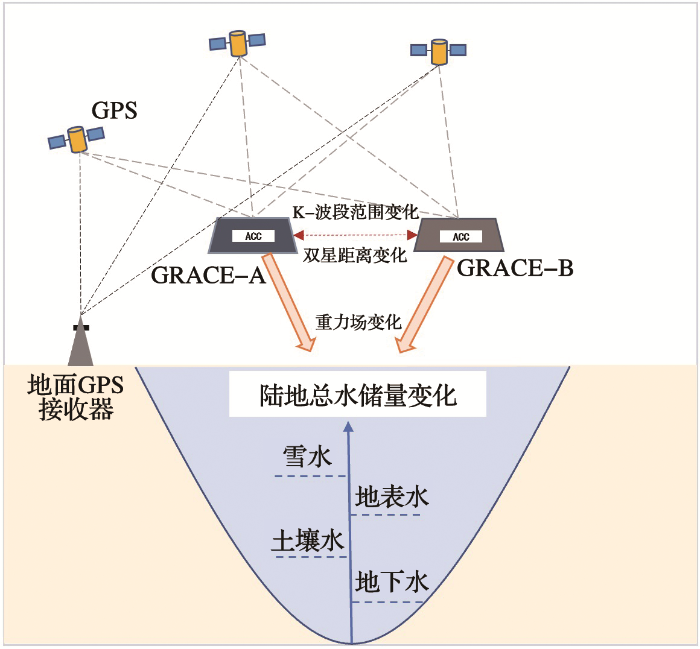 ... GRACE双星都配备了星载摄像机和加速度仪,通过高轨GPS(Global Positioning System)接收机和微波测距系统测量卫星的位置和速度,距离改变反映了地球重力场的变化[32].长期来看,GRACE卫星监测的地球重力场变化反映了固体地球的质量变化,而在较短的时间尺度上,地球质量的改变主要是由于水在地球表面不断重新分布造成的[33].GRACE可以通过感应地球质量局部改变引起的微小引力变化来监测区域内陆地总水储量(Total Water Storage, TWS)的变化.当两颗卫星绕着地球环绕时,重力异常区会先后影响前位卫星和尾随卫星,地球质量的变化会引起两星间微小的加速和减速,改变它们之间的距离[34].为了测量这个不断变化的距离,GRACE双星不断向彼此发射微波脉冲,并对返回信号的到达时间进行计时.将测距数据与高轨GPS定时跟踪、星迹追踪器的姿态信息以及加速度仪的非引力效应相结合,可以反演出地球重力场月值数据,监测其随时间的变化,并转化为以等效水柱高的形式表示的陆地总水储量变化[33,35](图4). ...