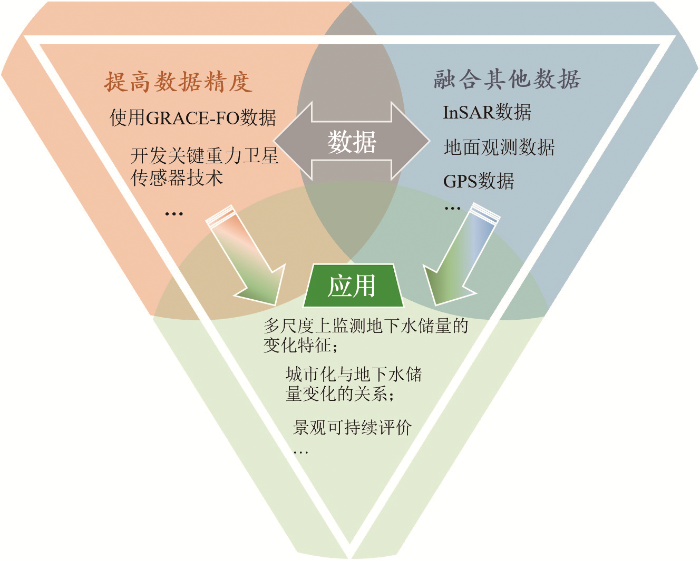 其次,GRACE数据的不确定性也会影响监测精度。GRACE数据的不确定性主要来源于GRACE数据产品与处理方法,以及其他水层数据。Feng等[21]分别采用CSR、GFZ、JPL和GRGS(Groupe de Recherche de Géodésie Spatiale)提供的GRACE数据产品计算了2003—2010年华北地区地下水耗竭率及其空间格局,发现地下水耗竭率在(7.6±1.4)~(9.2±0.8) km3/a,结果有一定差异。同时,基于不同数据处理方法得到的地下水储量变化的空间格局也有所不同。此外,其他水层数据的选择也会在一定程度上影响监测结果的准确性。垂直水层中地下水以外水层的水储量变化数据主要来源于陆表模型,而这些数据在预测与模拟中的不确定性会直接影响地下水储量的变化,进而对监测结果造成影响[66]。监测结果验证中,现场实测数据选择中监测网的覆盖程度及其布点分布位置的考虑也会影响监测结果与实测数据的相关性,进而影响监测精度。