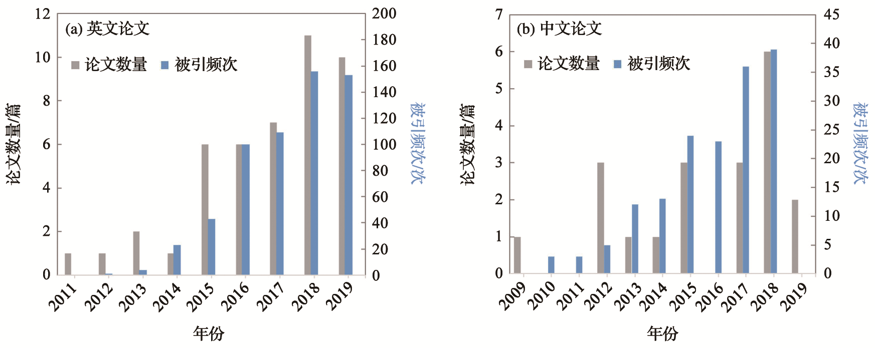 | 图1 基于GRACE卫星监测中国地下水储量变化的论文数量和被引频次 |