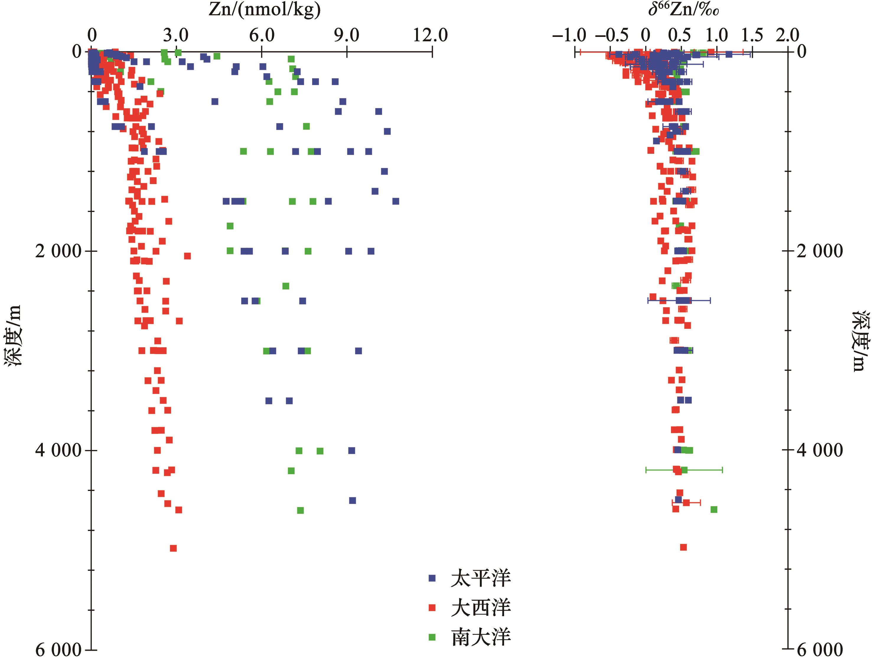 | 图2 现代海洋纵剖面溶解态锌浓度及同位素组成变化 数据引自参考文献[ |